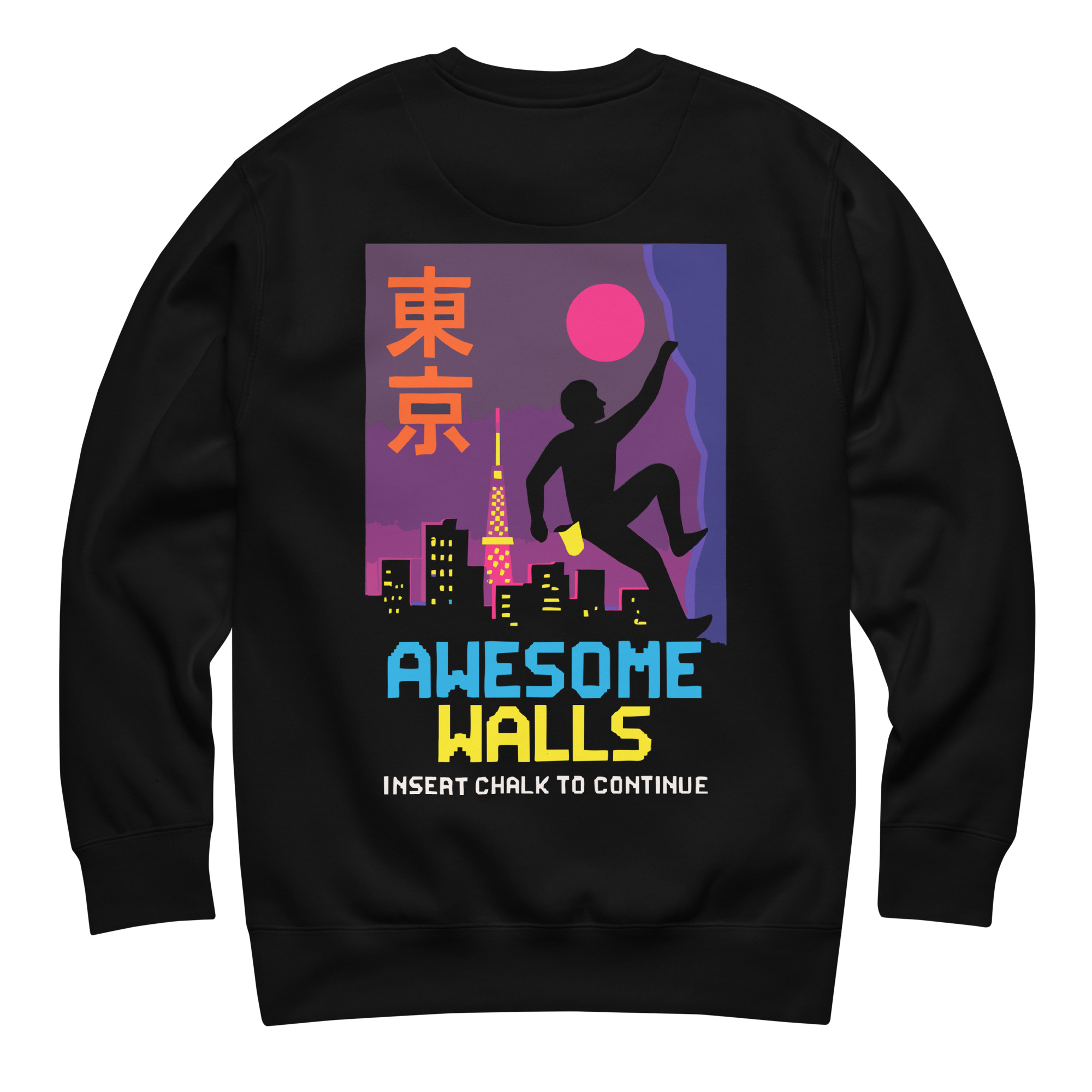 Step into the city lights and climb beyond the skyline with the Awesome Walls “Tokyo Nights” Sweatshirt. Featuring a bold silhouette of a climber scaling against Tokyo’s iconic skyline, complete with the glowing Tokyo Tower and a retro-inspired neon moon, this design fuses the thrill of climbing with the energy of urban adventure. The playful tagline “Insert Chalk to Continue” nods to classic arcade culture, making it a must-have for climbers, gamers, and streetwear fans alike.